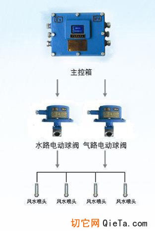 皮带机开机后,开停传感器将信号送入主控箱,主控箱同时控制高压风阀、高压水阀开启,将高压风、高压水输送到风水喷头(即气水喷头) 实现风水联动喷雾喷雾降尘。人经过时(通过热释电传感器感应)关闭球阀暂停喷雾,人经过后延时设定的时间后打开球阀继续喷雾。皮带机停机后,主控箱控制电动球阀延时到设定的时间后,关闭球阀停止喷雾。
