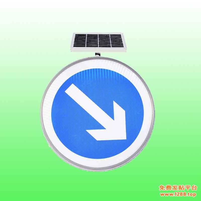 太阳能靠右行驶标志介绍: 太阳能靠右行驶标志是以多晶硅太阳能板、蓄电池组件为能源,它利用太阳能板将白天的阳光转换成电能贮存于蓄电池中,当夜幕降临、视线昏暗或雨雾天气等视线不佳情况下,限速标志牌上的发光二极管自动启动闪烁,通过LED发出亮光来勾画图案轮廓,传达交通信息。
