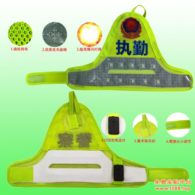 Led灯:采用超亮led(发光二极管)冷光灯珠镶嵌在反光袖标上,有主动发光警示、亮度高、节能、防水灯突出优点,三种闪烁模式分别为:快闪、慢闪、常亮。