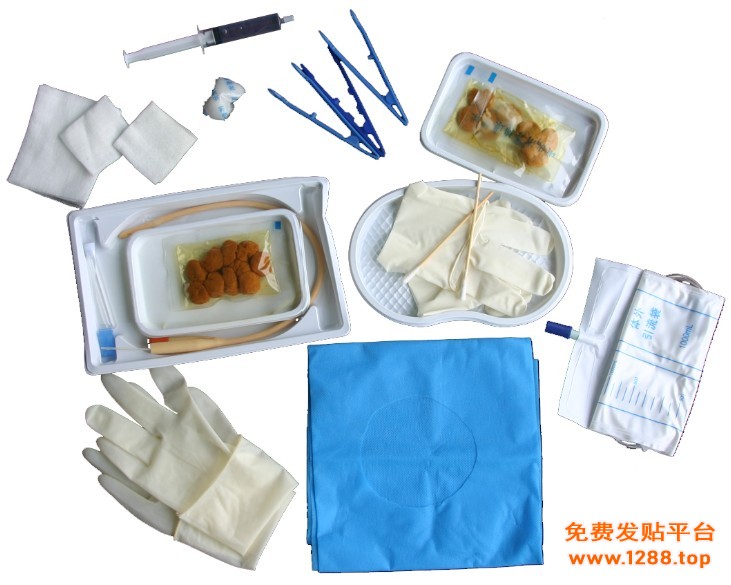 b)打开包装,打开包装,展开包布,戴上手套,按临床常规依次使用导尿包内组件。