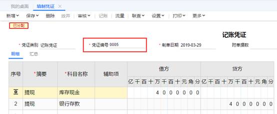 1、如下图,在凭证编号为0004的凭证前面插入0004号凭证,那么原来的0004号凭证号就会变成0005号凭证