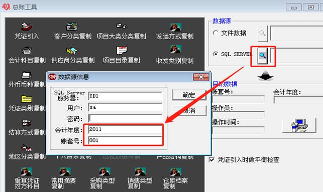 3、进入总账工具,数据源选择SQL SERVER,点击放大镜,录入需要导出的账套号与年度,如下图: ![]() 4、目的数据,就是需要导入的账套。点击“电脑”所示图标,并登录要导入的账套,如下图操作: